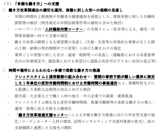 少数精鋭成長モデルの実現に向けて、労働関係法制見直しの必要性を訴えた。まず繁閑の事前予測が困難な業界への1年単位の変形労働時間制の労働時間の事後通告、フレックスと通常勤務の組み合わせの容認を要求。また時間外上限規制の年間回数要件、運輸業の改善基準告示の休憩規制の緩和も求めた。