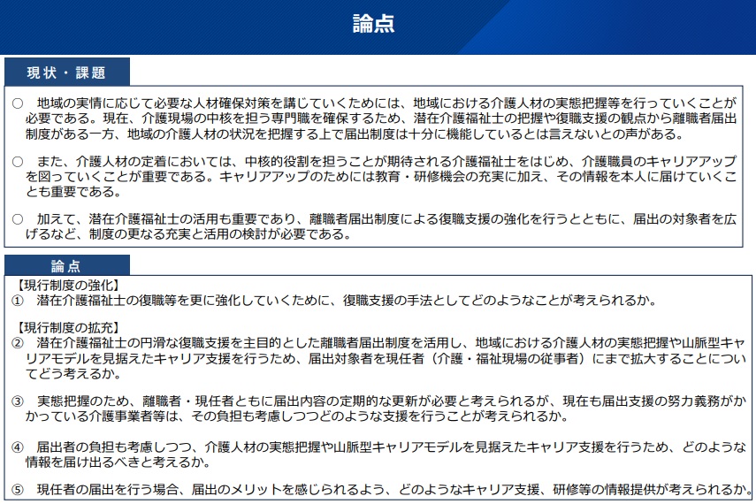 2017年4月開始の介護人材の届出制度は、見直すべきとの意見が相次いだ。現行は介護福祉士に氏名や住所、連絡先などの都道府県福祉人材センターへの届出を離職時に努力義務化。潜在介護福祉士の把握・復職支援に活用する狙いだが、十分に機能していないとの意見が大勢を占めた。