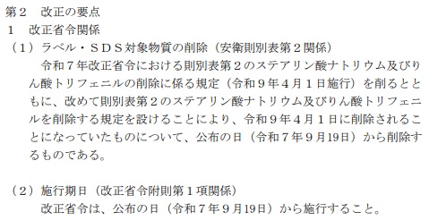 厚生労働省は危険性・有害性分類に基づくリスクアセスメントの対象から、二つの化学物質「りん酸トリフェニル」「ステアリン酸ナトリウム」を削除した。「りん酸トリフェニル」に関しては、省令公布日付けで濃度基準値設定対象物質からも削除する。