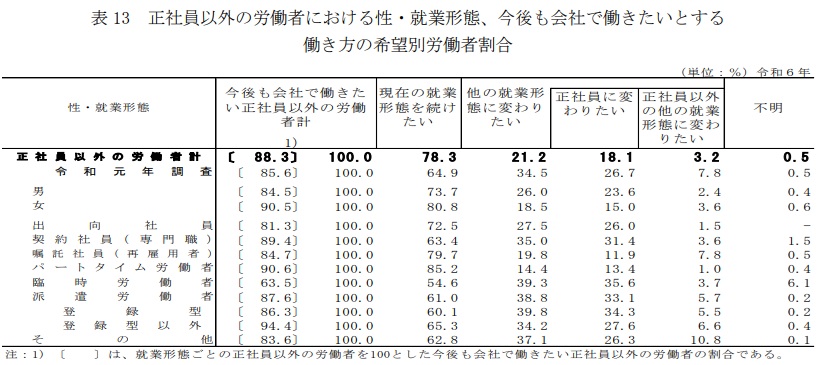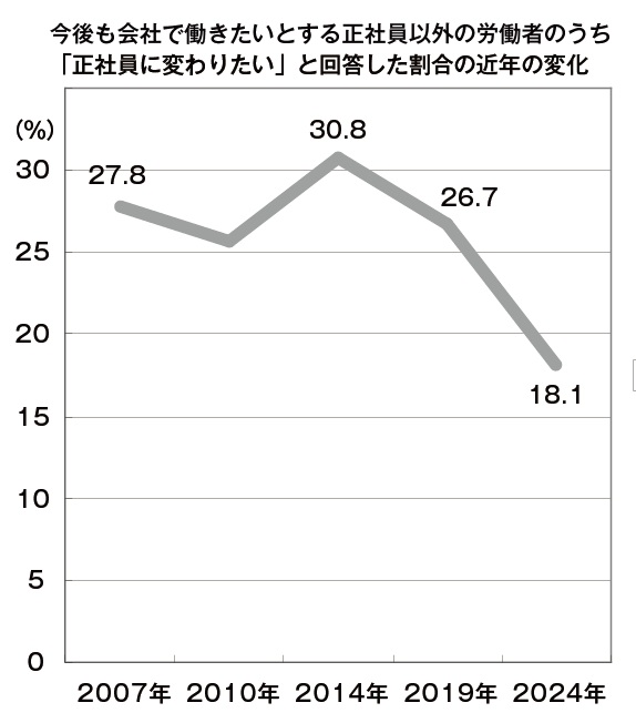 厚生労働省がこのほど発表した2024年就業形態の多様化に関する総合実態調査で、正社員以外の労働者の88.3%が「今後も会社で働きたい」と回答し、うち今後希望する就業形態が「正社員」の不本意非正規の割合は、19年の前回調査比8.6㌽減の18.1%と大幅に低下。比較可能な範囲で不本意非正規の割合の推移をみると、07年に27.8%、10年に25.7%となり、14年で30.8%とピークを迎え、以降は19年に26.7%、24年に18.1%となるなど近年の低下傾向を鮮明にした。