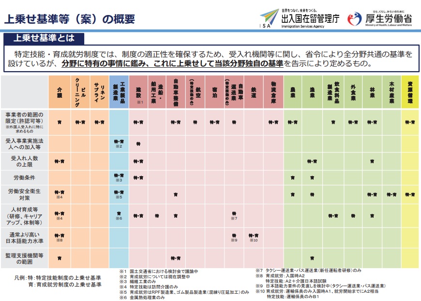 出入国在留管理庁と厚生労働省は、特定技能・育成就労制度の適正化を図るための上乗せ基準を告示で定める方針だ。受入れ機関などには分野共通の基準を設定するが、産業特有の事情を勘案して受入れ範囲や労働条件などの基準を上乗せする形で告示で設定する。