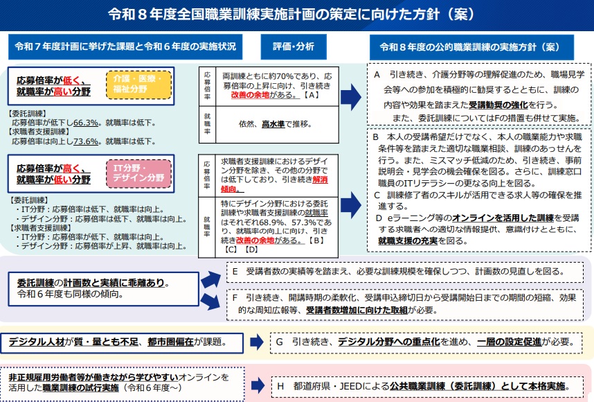 応募倍率が低く、就職率が高い「介護・医療・福祉分野」では職場見学の参加率を高めるとともに、受講勧奨の強化を示唆した。反対に応募倍率が高く、就職率の低いIT分野やデザイン分野では訓練窓口職員のITリテラシーの強化、訓練スキルが活用できる求人の確保を充実。特にデジタル人材は質・量とも不足し、都市圏偏在が課題だとして、一層の設定促進を図るなど引き続き重点化する必要性を訴えた。
