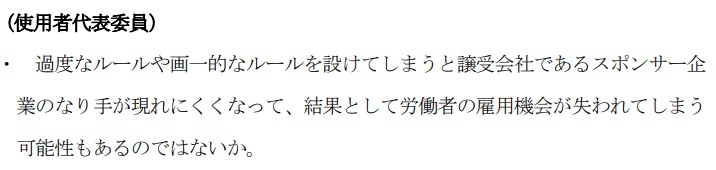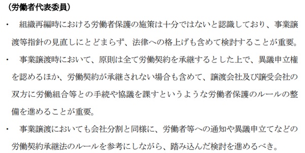 労働者側委員は事業譲渡等指針の見直しにとどまらず、会社分割と同様に事業譲渡でも労働者に対する通知や意見聴取、労働組合との事前協議を法的に整備するよう要求。一方、使用者側委員は雇用維持に悪影響を与えるとして、過度なルールの制定に反対した。