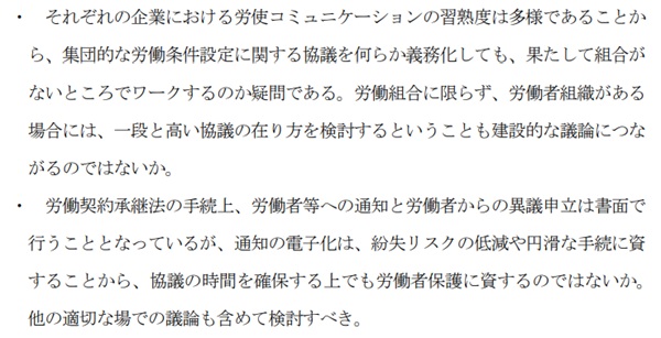 このほか使側は、労働組合も含めて労働者組織のない場合の集団的な協議の実効性に疑問を呈した。また労働契約承継法の手続に関し、労働者への通知と労働者からの異議申立を電子的な方法で行うことも提案した。
