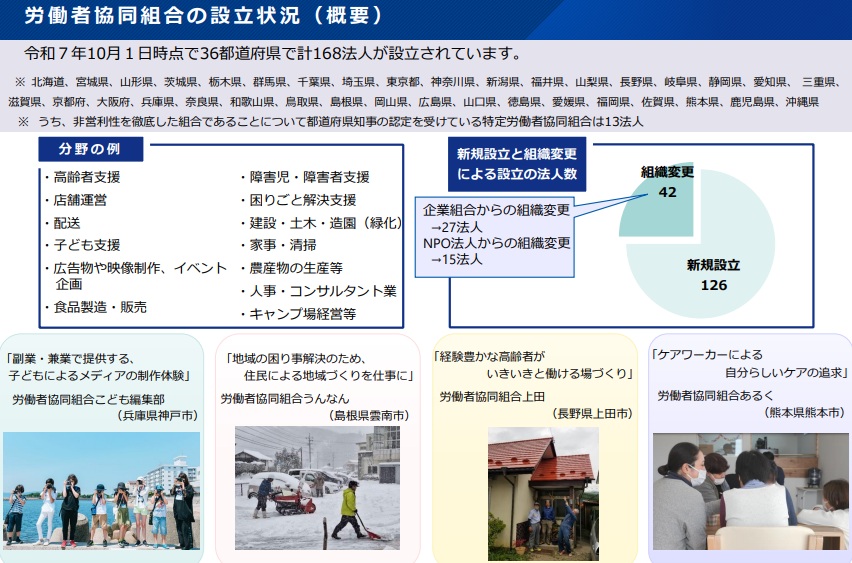 厚生労働省は労働者協同組合法施行3年が経過した10月1日時点で、36都道府県で168法人が設立され、うち非営利性を徹底する特定組合が13法人認定されたと発表した。168法人中126法人が新設、42法人が組織変更。変更の内訳は企業組合からが27法人と多く、NPO法人からは15法人だった。