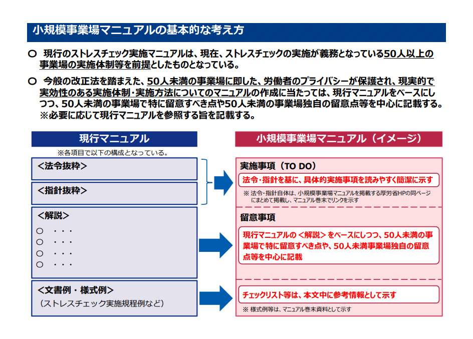 労働安全衛生法改正で全事業場規模にストレスチェック制度が義務化されるのを受けて、50人未満規模事業場向けのマニュアル案を作成。