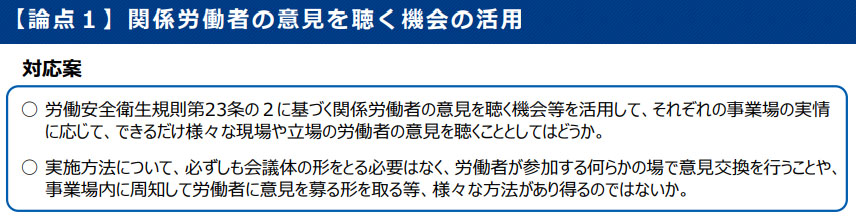 現行マニュアルを参考に実施事項や留意事項を盛り込むが、実施時の意見聴取に関して必ずしも会議体の形を求めず、例えば業務ミーティングや打合せなどの機会を通じた聴取も幅広く認める方針だ。