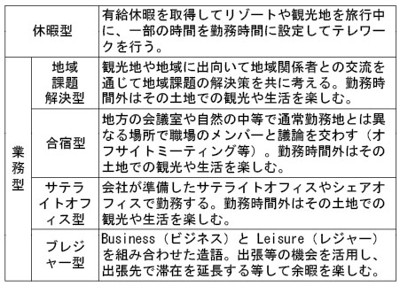 ワーケーションとは、Work(仕事)とVacation(休暇)を組み合わせた造語で、テレワーク等を活用し、普段の職場や自宅とは異なる場所、例えばリゾート地や温泉地、国立公園等で余暇を楽しみつつ仕事を行う制度。実施形態のイメージは以下の通り。