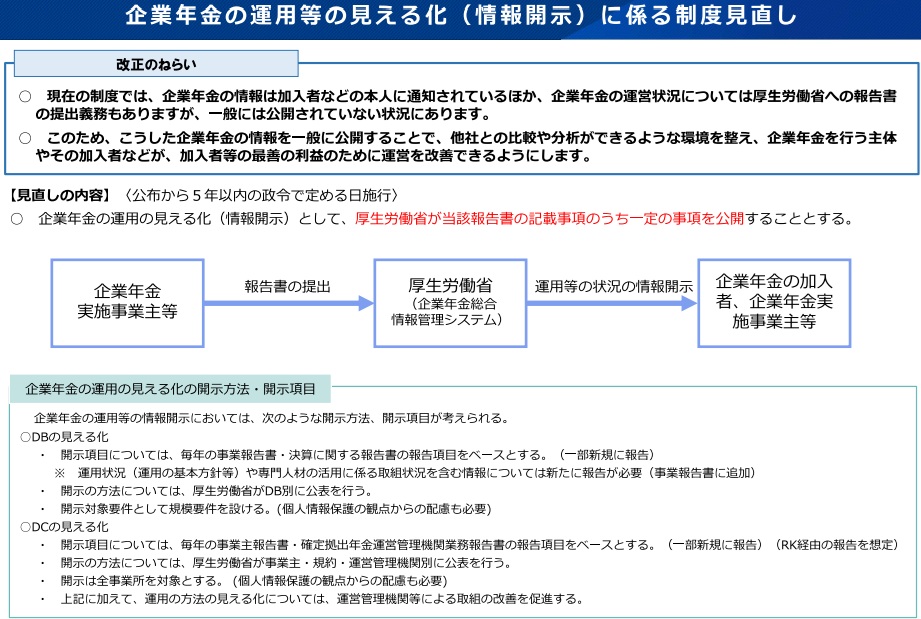 厚生労働省はこのほど、企業年金の加入者のための運用等の見える化等に関する懇談会の初会合を開催した。年金改革法で手当した企業年金の情報開示強化について、他社との比較・分析、運営改善を可能とするため報告書の記載事項の一部をサイト上で公開する。