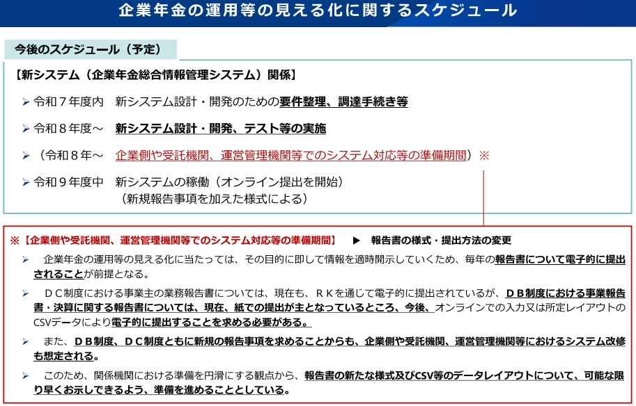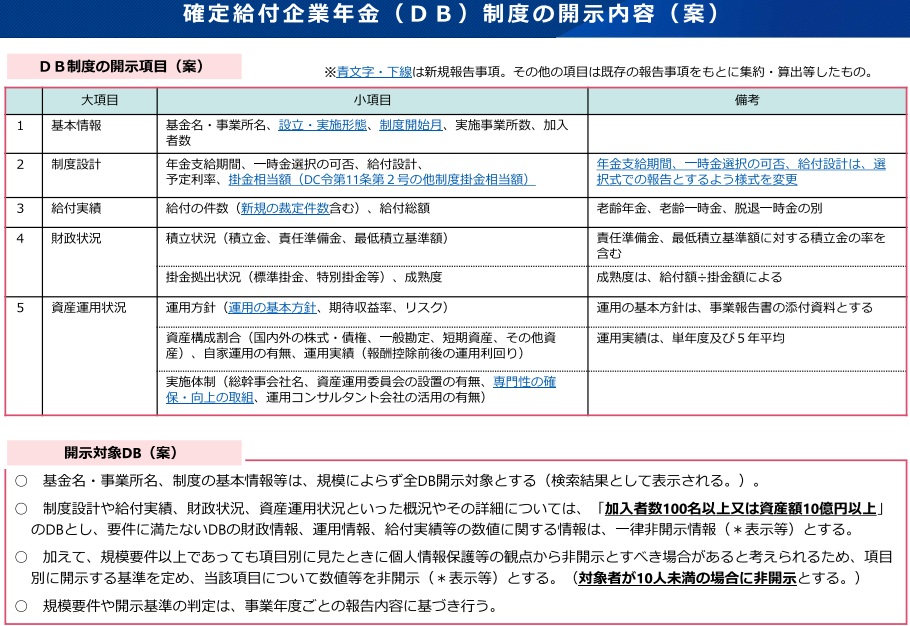 確定給付企業年金は、加入100人以上または資産10億円以上の加入者数や給付件数・額、予定利率、積立金、資産構成割合などを開示。一方、企業型確定拠出年金は対象者10人未満を非開示とし、加入者数や掛金総額、元本確保型の有無、運用資産額、離職者に占める自動移換率などを明示する方針だ。
