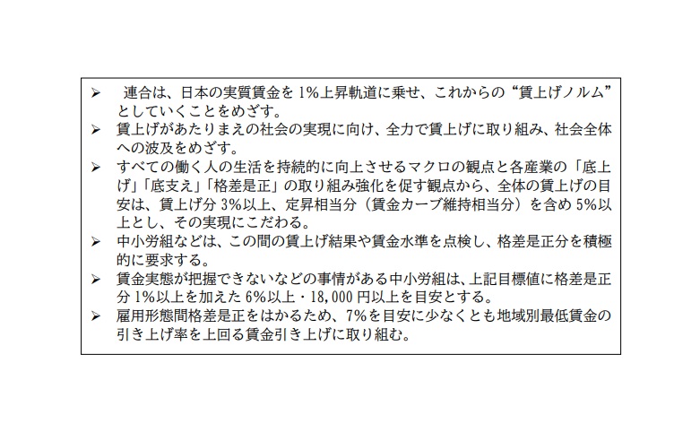 25年春闘と同様に「賃上げ分3%以上、定期昇給分を含め5%以上」を賃上げの目安とし、「実質賃金1%上昇」を新たな社会規範とする目標を掲げる。
