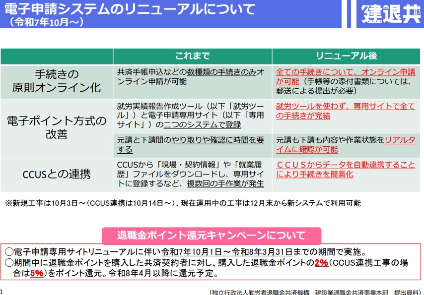 このほか10月から来年3月31日まで、「退職金ポイント還元キャンペーン」を実施。キャンペーン中に退職金ポイントを購入した共済契約者に対して2%、CCUS連携工事は5%のポイントを来年4月以降に還元する予定だ。
