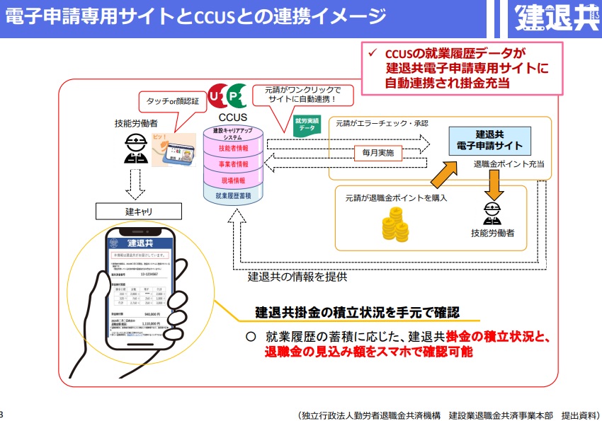 システムのリニューアルに伴い、全手続のオンライン申請を原則可能にする。手帳など添付書類の郵送は必要だが、新規工事は10月3日から、現在運用中の工事は12月末から新システムでの利用が可能。他方で10月14日には、建設キャリアアップシステム(CCUS)との自動連携で手続を簡素化する。