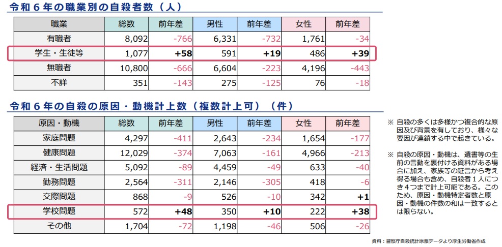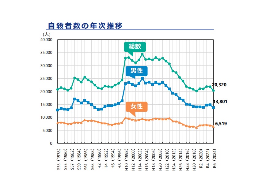 政府はこのほどの閣議で、2025年版自殺対策白書を決定した。24年の自殺者数は、前年比1517人減の2万320人と2年連続で減少して過去2番目に少なくなったが、小中高生が529人と最多を更新した。