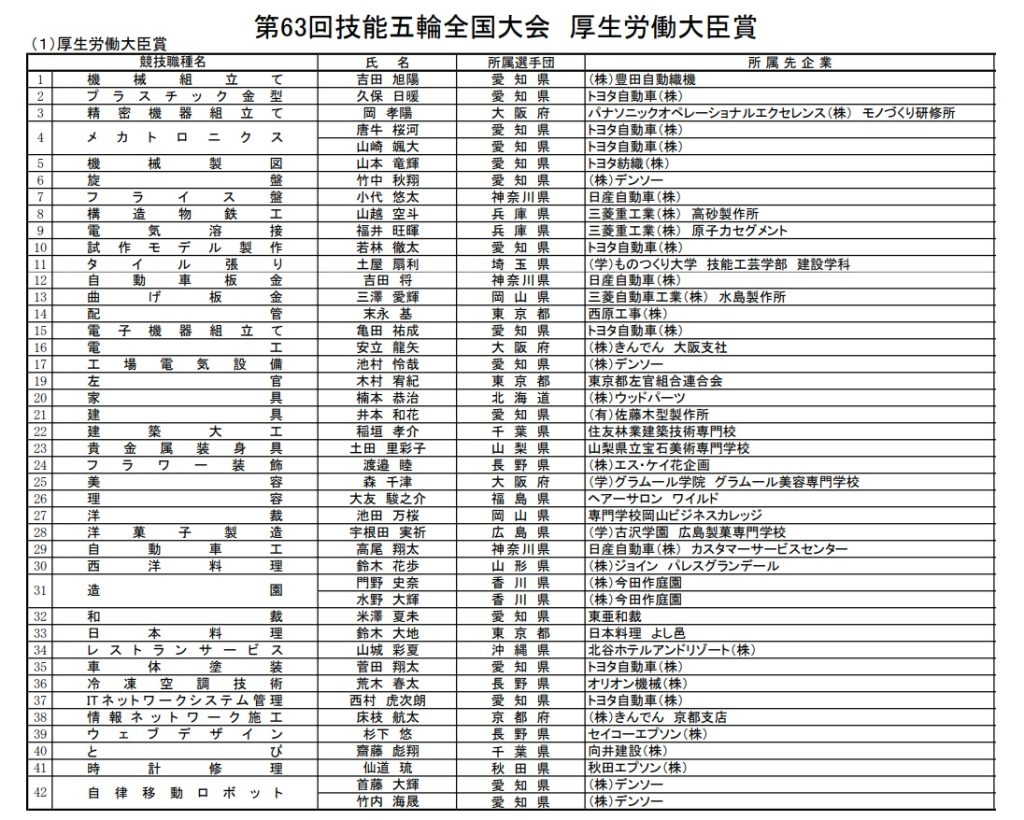 愛知県で開催した63回大会では、全42職種の競技に若年技能者1025人が参加。「機械組立て」の吉田旭陽氏、「電子機器組立て」の亀田祐成氏、「建具」の井本和花氏、「和裁」の米澤夏未氏など各競技職種の金賞受賞者には厚労大臣賞が贈られた。