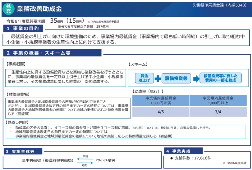 個別の施策をみると、最低賃金の大幅な引上げを見据え、中小企業の賃上げを支援する内容が目をひく。設備投資などを行うとともに、事業場内最低賃金を引き上げた中小企業に対し、費用の一部を助成する業務改善助成金の拡充に同20億円増の35億円を要求。現在は事業場内最低賃金に応じ、1千円以上で4分の3、1千円未満で5分の4に設定している助成率の区分を見直すとともに、引上げ額が30・45・60・90円の4コース制を3コース制に再編する。