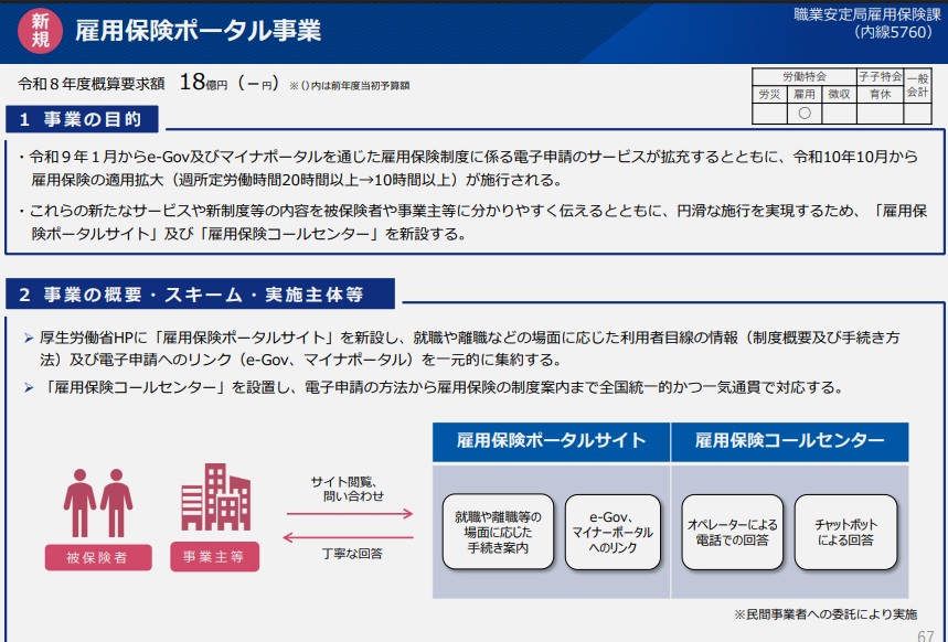 3つの新規施策をみると、まず雇用保険関係では、コールセンターとポータルサイトを新設する雇用保険ポータル事業に18億円を計上した。電子申請の方法から雇用保険の手続案内までを全国統一的にコールセンターで対応。就職や離職といった場面に応じた手続方法や制度概要、e-Govとマイナポータルの電子申請のリンクをポータルサイトへ一元的に集約する。27年1月からの電子申請対象手続の充実や、28年10月から労働時間要件を週10時間以上に改める適用拡大を見据え、制度や手続の周知を強化する。