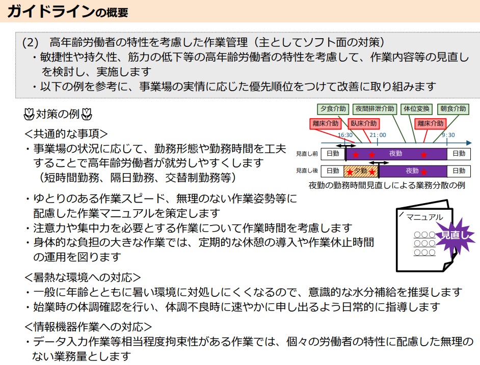 62条で事業者に、中高年齢者への労働災害防止と配慮が必要な場合の心身の条件に応じた適正配置を努力義務化しているが、26年4月から62条の2を新設して高年齢者に特化した労働災害防止措置を求める。