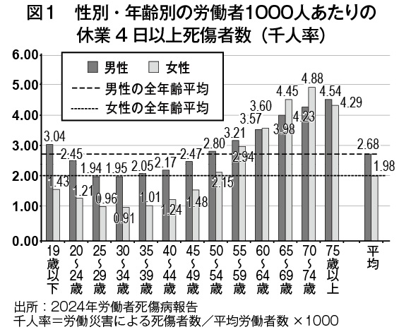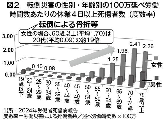 災害は加齢による発生率の高まりが顕著で、千人あたりの死傷者数(千人率)を年齢別にみると、男女ともに50代後半で全年齢平均を上回り、加齢に応じて上昇する傾向がみられる(図1)。また転倒災害は特に高齢女性で骨折のリスクが高く(図2)、平均休業日数は48.5日と比較的長い。