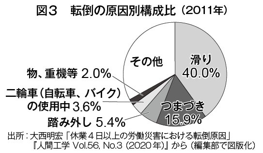 厚労省がウェブで公開している死傷病報告を無作為抽出した労働災害の転倒事例について、11年の6685件、12年の6976件の発生状況を分析。11年の結果では「滑り」が40.0%、「つまづき」が15.9%、「踏み外し」が5.4%などとなり(図3)、12年の結果もほぼ同様の傾向だった。