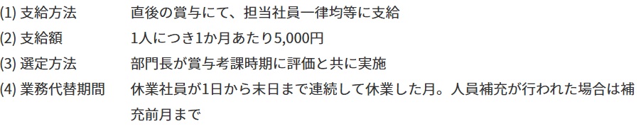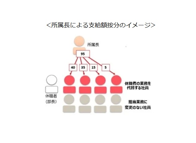 第一生命ホールディングス(東京都千代田区)は10月から、長期休業の取りづらさといった心理的負担を軽減するため、新たに「産育介休サポート手当」を導入した。人員補充の有無にかかわらず連続3カ月以上の休職を対象とし、休職者の職位に合わせて支給額の上限を設定した上で、業務を代替・サポートする社員の負担に鑑みて所属長が支給額を決定。例えば部長級の役職者が介護休暇を取得し、社員4人が業務を代替・サポートする場合、全体の支給額を95万円と設定し、業務負荷に応じて40万円、35万円、15万円、5万円などと按分して支給する。