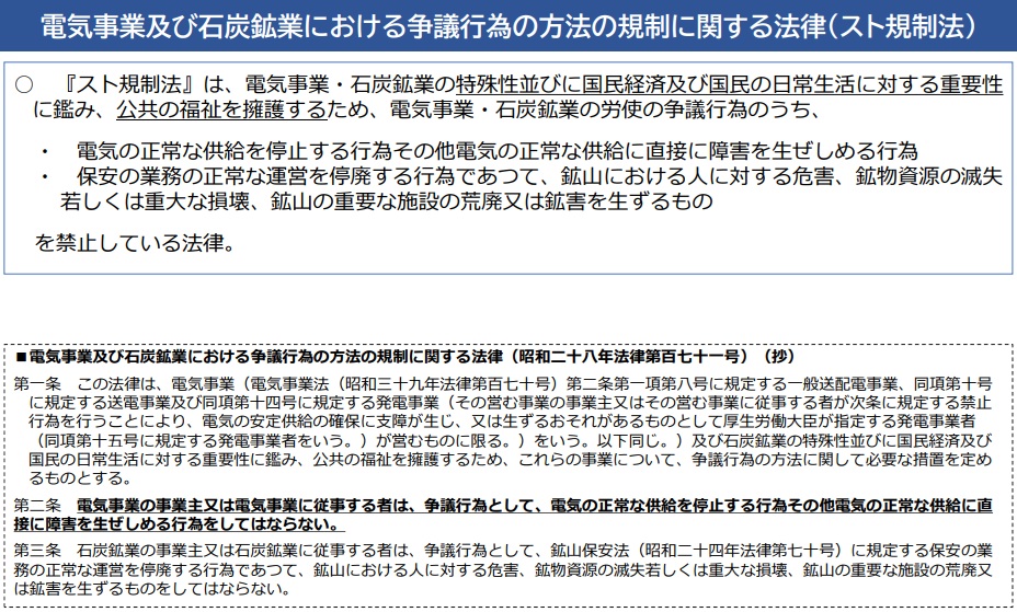 スト規制法は、正当でない争議行為を禁止する目的で1952年に制定してから半世紀以上が経過。大規模停電発生による公共の福祉を擁護する大義名分で、労働関係調整法が別途規制しているにもかかわらず屋上屋としてスト規制法を維持してきたが、近年は争議行為の実績もなく、良好な労使関係に基づいて電力は安定供給されている。