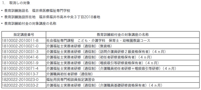 指定を取り消すのは、学校法人金井学園が運営する福井県医療福祉専門学校(福井県福井市)の「社会福祉専門課程こども・介護学科保育士・幼稚園教諭コース」など9講座。金井学園は学部設置に関する寄附行為変更認可申請で不正が判明し、2023年11月28日付けで不認可期間の決定を受けていたことから、著しく不適当と認められる教育訓練実施者に該当すると判断した。
