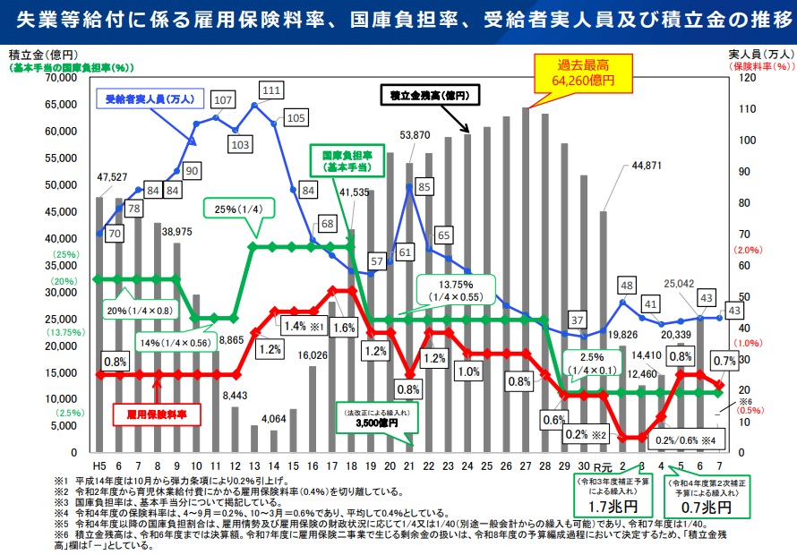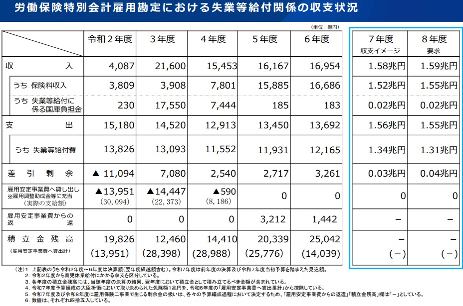 失業等給付の2024年度収支はプラス3261億円で、二事業の雇用安定資金からの返還額と合わせると積立金残高が約5千億円増加。保険料率は原則0.8%で、現行0.7%に引き下げているが、弾力条項の要件を満たして最大で0.4%まで引下げが可能と示唆した。