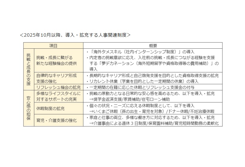 社内インターンシップの新たな制度として「海外タメスキル」を創設するほか、内定者の入社前の海外短期留学・資格取得費用を補助する「夢デカネーション」を導入。また長期的キャリア形成と自己啓発支援を拡充し、学業のために一定期間の休業を認める「リカレント休業」も制度化した。