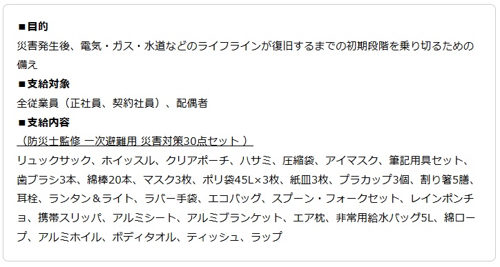 災害発生直後から、電気・ガス・水道といったライフラインが復旧するまでの初期段階を想定し、最低限の生命維持と避難生活を支える防災グッズをセットにして支給。家族の安全を確保する観点から、全従業員のほかに配偶者も支給対象に加えた