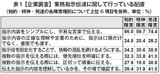 障害者職業総合センターの「職場における情報共有の課題に関する研究」(2025年3月)によれば、知的障害・精神障害・発達障害など認知機能における障害種別では、業務指示に当たり指示内容の簡潔さや複数の指示を区切って順番に伝えるなど、認知的負荷を減らすことで指示が正確に伝わる配慮を行う企業の割合が高い(表1)。聴覚障害や視覚障害など感覚機能での障害では、本人が受け取りやすい媒体・方法への配慮の割合が比較的高くなっている。