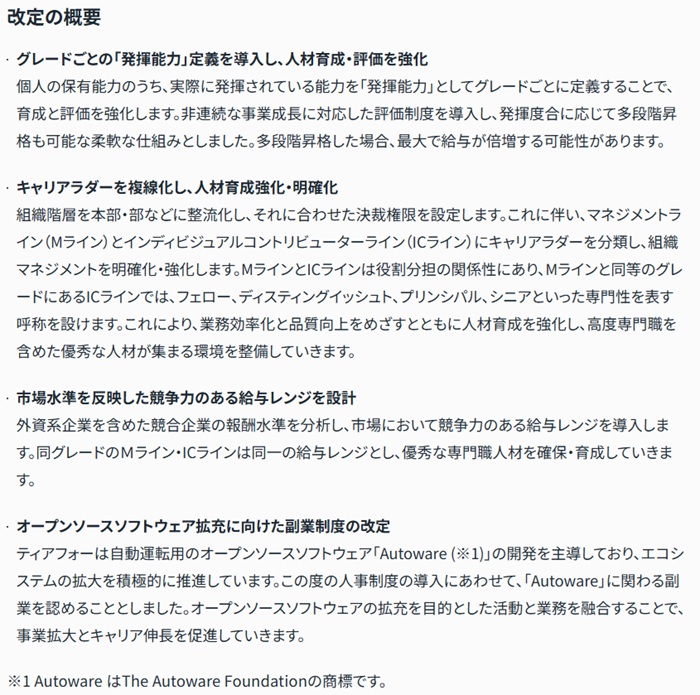 自動運転OSを開発するティアフォー(東京都品川区)は優秀なグローバル人材の獲得と価値発揮を目指し、このほど新トータルリワード(グレード・評価・報酬)制度を導入した。個人の保有能力のうち、実際に発揮されている能力をグレードごとに定義し、発揮度合いで評価・昇格する仕組みとしたほか、外資も含めた競合企業の報酬水準を分析した上で市場競争力に富む給与レンジを設定。また決裁権限も含め、「マネジメントライン」「インディビジュアルコントリビューターライン」へとキャリアラダーを複線化し、新たに自動運転用オープンソースソフトウェアに関わる業務に限定して副業も容認する。
