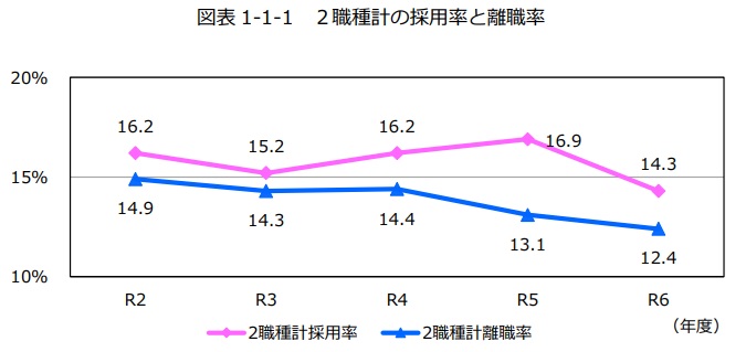 介護労働安定センターが実施した介護労働実態調査によると、2024年度の訪問介護員と介護職員の離職率は前年度比0.7㌽減の12.4%と2年連続で低下した。