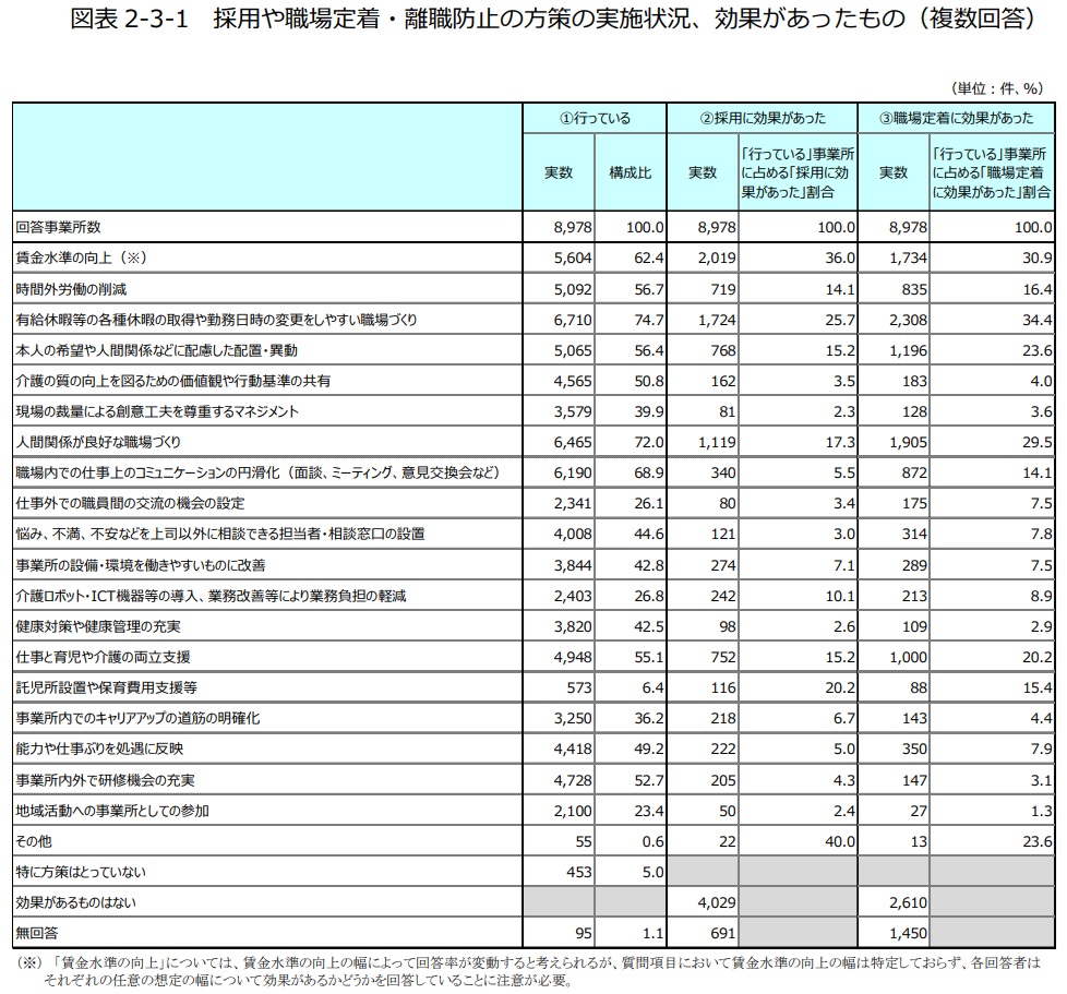職員の定着に効果があった方策を複数回答で尋ねたところ、「休暇取得や勤務日時変更をしやすい職場づくり」が34.4%、「賃金水準の向上」が30.9%、「人間関係が良好な職場づくり」が29.5%などとなった。