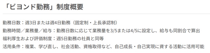 学び直しや資格取得、社会活動、複業といった自己成長・実現に資する活動の実施を要件に、週3日勤務または週4日勤務を上長が承認。固定した勤務日数に応じて、業務量と給与を5分の3または5分の4に圧縮するが、福利厚生や評価制度は週5日勤務者と同等とする。