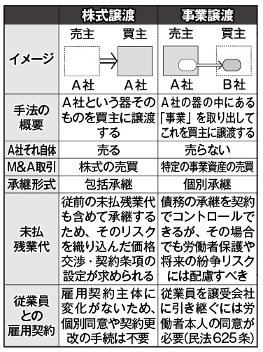 M&A、とくに株式譲渡型では、会社そのものは存続するため、従業員との雇用契約や未払賃金債務も含めてそのまま買主に引き継がれます。つまり、M&A前に発生した未払い残業代も、会社に残存する以上、最終的には買主の責任で支払う必要があります。
