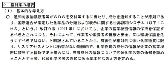 労働安全衛生法改正で来年4月から、譲渡時の化学物質の成分表示が財産上損失を与える「営業秘密」に当たる場合に代替化学名の通知を容認。新指針では対象を有害性が低いものに限るとし、代替通知を行う場合の記載方法を整理した。