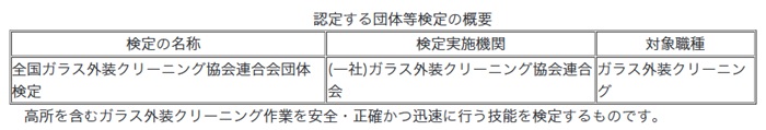 団体等検定は技能検定でカバーできない業種や職種のスキルを標準化するもので、2024年3月に制度化。今回認定されたのは、全国ガラス外装クリーニング協会連合会が実施する全国ガラス外装クリーニング協会連合会団体検定で、「家政サービス」「フォークリフト荷役」「コンクリート打込み・締固め工」に次いで4職種目となる。