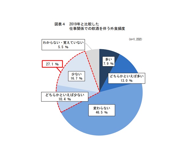 今年8月時点の仕事関係の飲酒を伴う外食の頻度が、コロナ禍前の2019年と比べて「少ない」と27.1%が回答したことが、このほど日本政策金融公庫の調査でわかった。