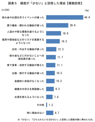 「変わらない」が46.5%で最も多いが、「多い」の20.9%を上回り、仕事の飲み会が減少していることを鮮明にした。少なくなった理由としては44.6%の「飲み会やお酒を伴うイベントが減った」、26.6%の「誘う機会・誘われる機会が減った」が多い。