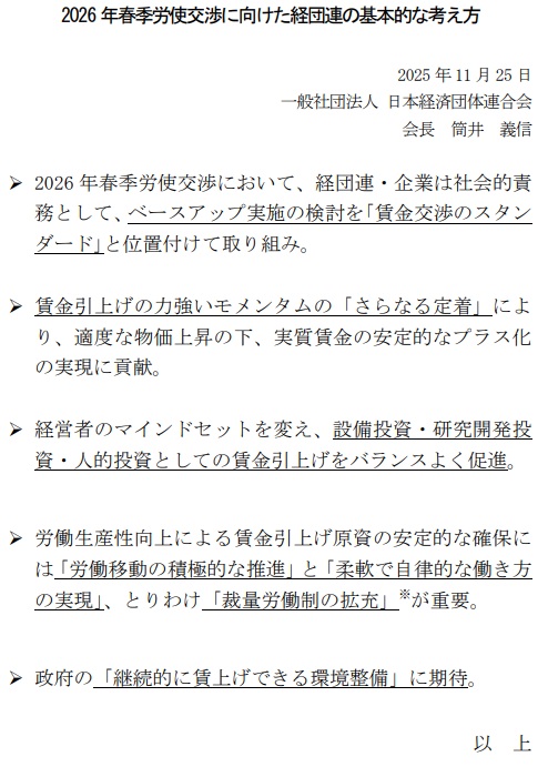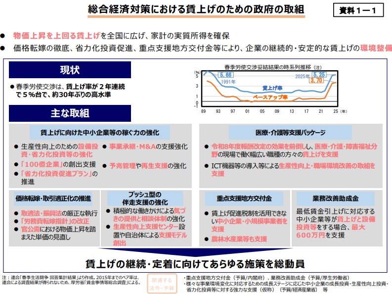 11月21日に閣議決定した総合経済対策に賃上げ環境整備施策を盛り込み、高市総理は「賃上げを事業者に丸投げしない」と強調して、5%超の賃上げの継続に向けて協力することで政労使が合意。