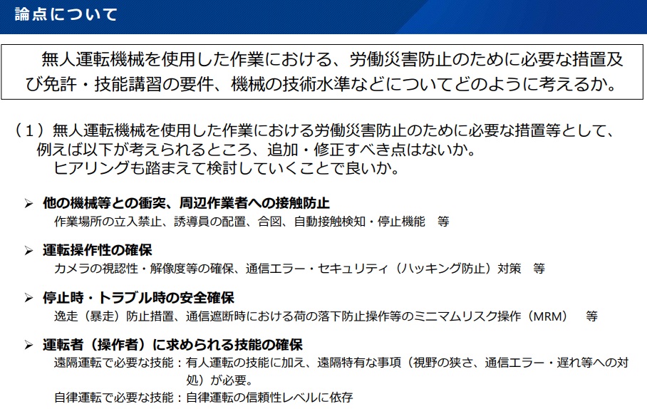 まず車両系建設機械など遠隔・無人運転を行うユーザー・メーカーから、開発・使用・規制の状況などを聴取。災害防止の観点で、個別に必要な法令措置、免許・技能講習の要件、無人運転機械の技術水準などについて検討する。