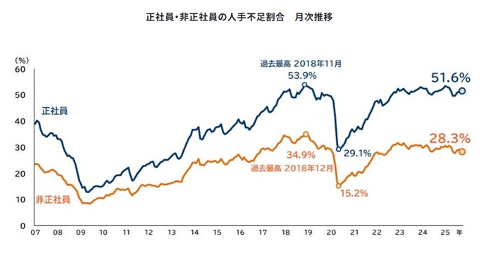 帝国データバンクが1万427社から回答を得た調査によると、2025年10月時点の企業の正社員不足を感じる割合は51.6%だった。前年比0.1㌽減と微減したが、4年連続で5割を超え人材不足感は高止まりしている。