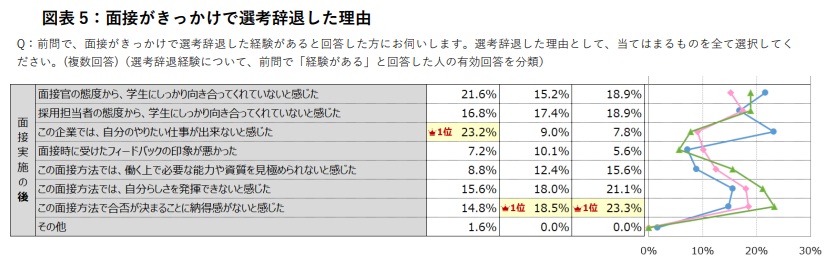 採用選考で個人面接を受けた大学生・大学院生の47.5%に選考辞退の経験があることが、リクルートマネジメントソリューションズの調査でわかった。個人面接の実施がきっかけで選考辞退した理由は、「この企業では自分のやりたい仕事ができないと感じた」が23.2%で最も多い。