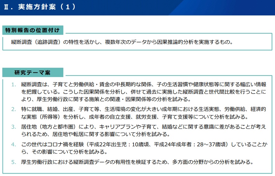 研究員を参集して、追跡調査と厚労行政の施策との関連、因果関係の分析を試みる。調査対象者の家庭環境や成長過程をはじめ、結婚・出産といったライフイベントや居住地に応じた行動の変化、コロナ禍の影響なども加味。複数年次にまたがる調査データの有用性を検証した上で、2027年冬頃を目途に特別報告をとりまとめる。
