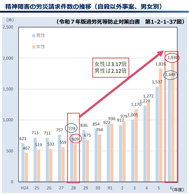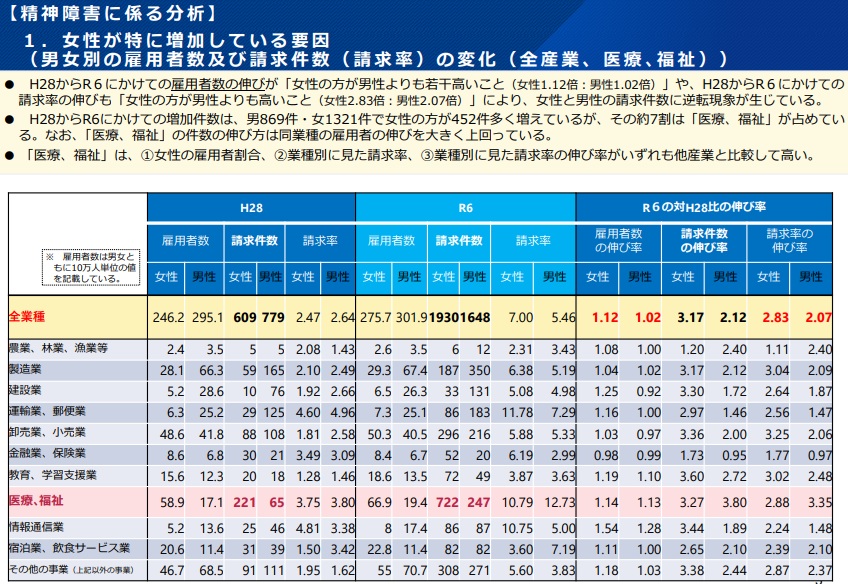 2024年の自殺を除く精神障害の労災請求を16年と比べると、男性869件増、女性1321件増で、女性の増加が請求件数を押し上げたと指摘。男女差452件を業種別にみると、女性の雇用者割合の伸びが高い「医療・福祉」が約7割を占めるなど女性の請求増加に寄与したと分析した。