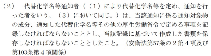 書類の保存などを規定する103条は、新たに4項を創設。代替化学名を通知した者に対し、代替化学名や通知対象物の成分などの記録に基づいて作成した書類の保存を義務づけている。