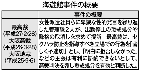 水族館などを運営する海遊館(「会社」)の男性従業員 X1および X2(「Xら」)が、それぞれ複数の女性従業員(派遣社員など)に対して、1年余りにわたり、 X1の不貞相手に関する性的な事柄や自らの性器、性欲の話、 X2の「30歳は、22、23歳の子から見たら、おばさんやで」などの発言、セクハラ研修を受けた後の X2の「あんなん言ってたら女の子としゃべられへんよなあ」「あんなん言われる奴は女の子に嫌われているんや」という趣旨の発言などのセクハラを行ったことなどを理由に、 X1は出勤停止30日、 X2は出勤停止10日の懲戒処分(「本件処分」)を受け、本件処分を理由に人事上も降格されたことから、会社に対し、本件処分や降格の有効性などを争った事案である。