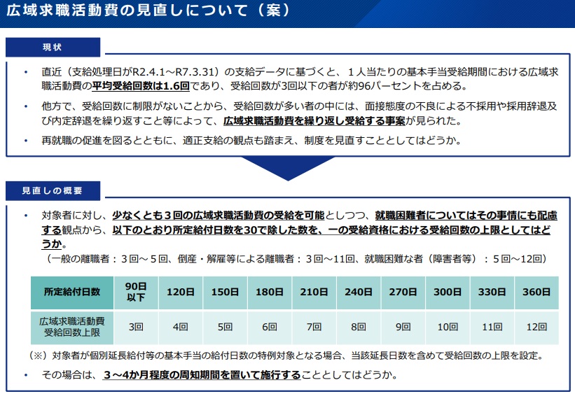 広域求職活動費は、遠隔地の求人事業所訪問時の交通費と宿泊料を支給するもの。採用や内定の辞退で繰り返し受給する求職者が散見されるとして、一受給資格につき受給回数に上限を設定。一般離職者3~5回、解雇などの離職者3~11回、障害者など就職困難者5~12回と制限をかけて適正化を図る。