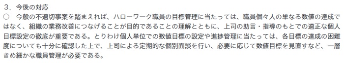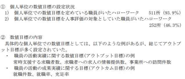 ハローワーク墨田の職員が就職件数月30件の目標達成を危ぶみ、架空登録した求職者を騙って面接を受けて4件を計上した問題を受けて調査。全国544所のハローワークで同様の不適切事案は把握されず、都道府県労働局の連絡窓口にも関連情報は寄せられなかった。一方、数値目標についてハローワークの93.9%が個人単位で設定し、46.3%が人事評価の対象としていることがわかった。